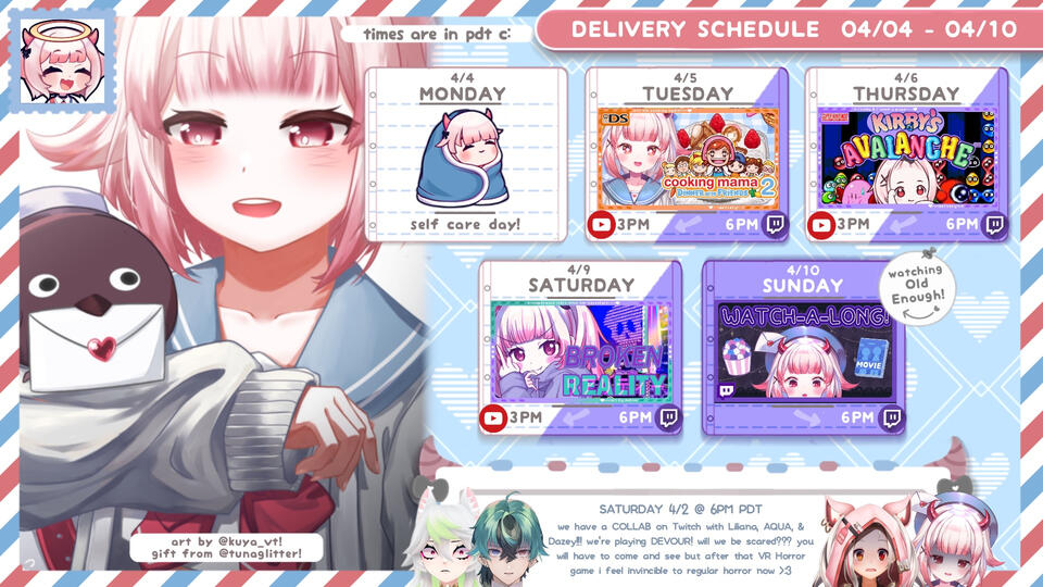 | Friday 4/15 | 2pm PDT | 【Collab】Kirby's Dream Course with Amiya | ❤️YouTube |